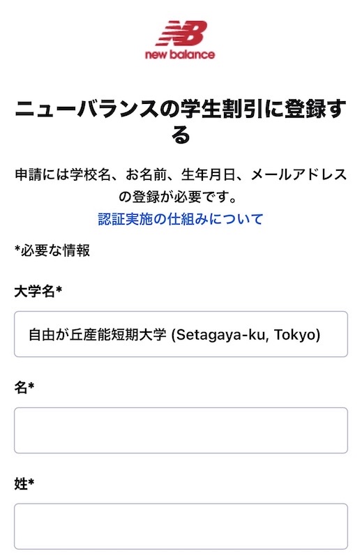 ニューバランスの「myNB for Students & Educators」にアクセスして、認証フォームより必要情報入力