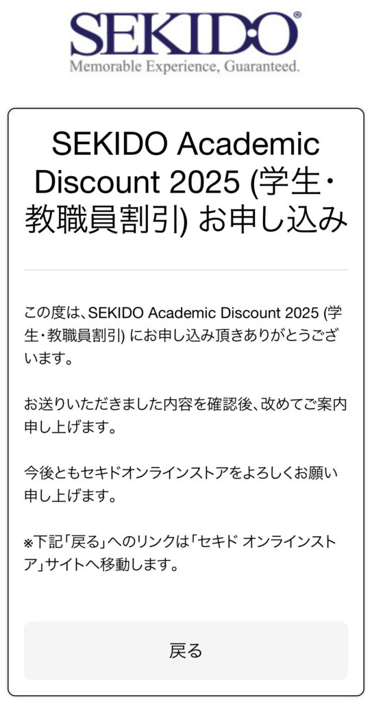 「SEKIDO Academic Discount(学生・教職員割引)」が利用可能です。